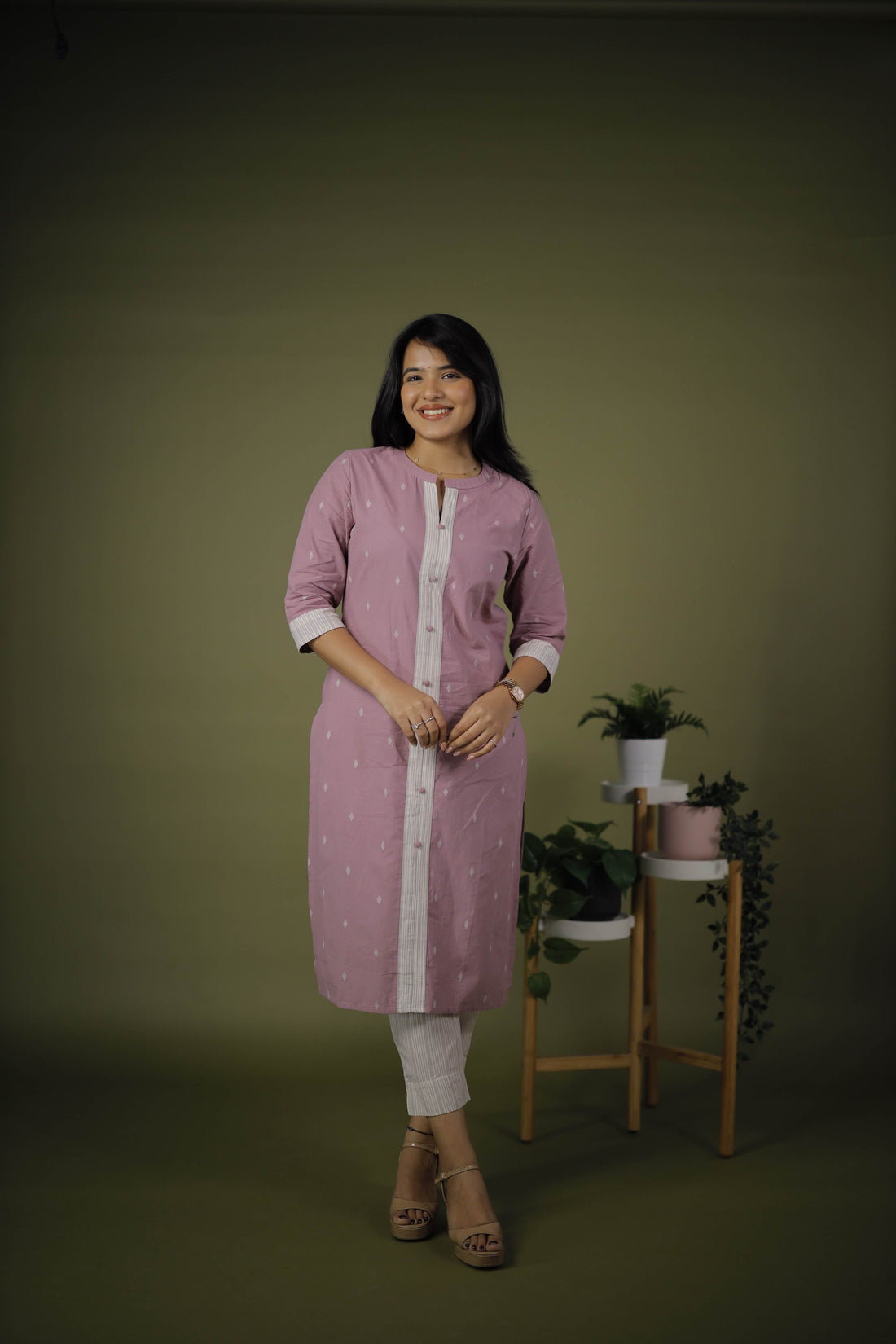 Fabric: Crafted from soft and breathable handloom cotton, ensuring all-day comfort.Color: Mauve-pinkKurta: Front button placket...
