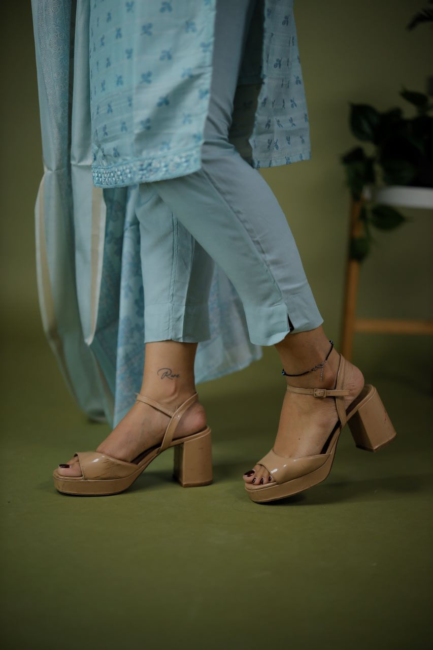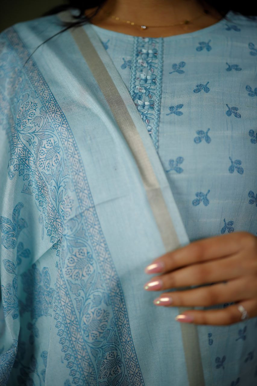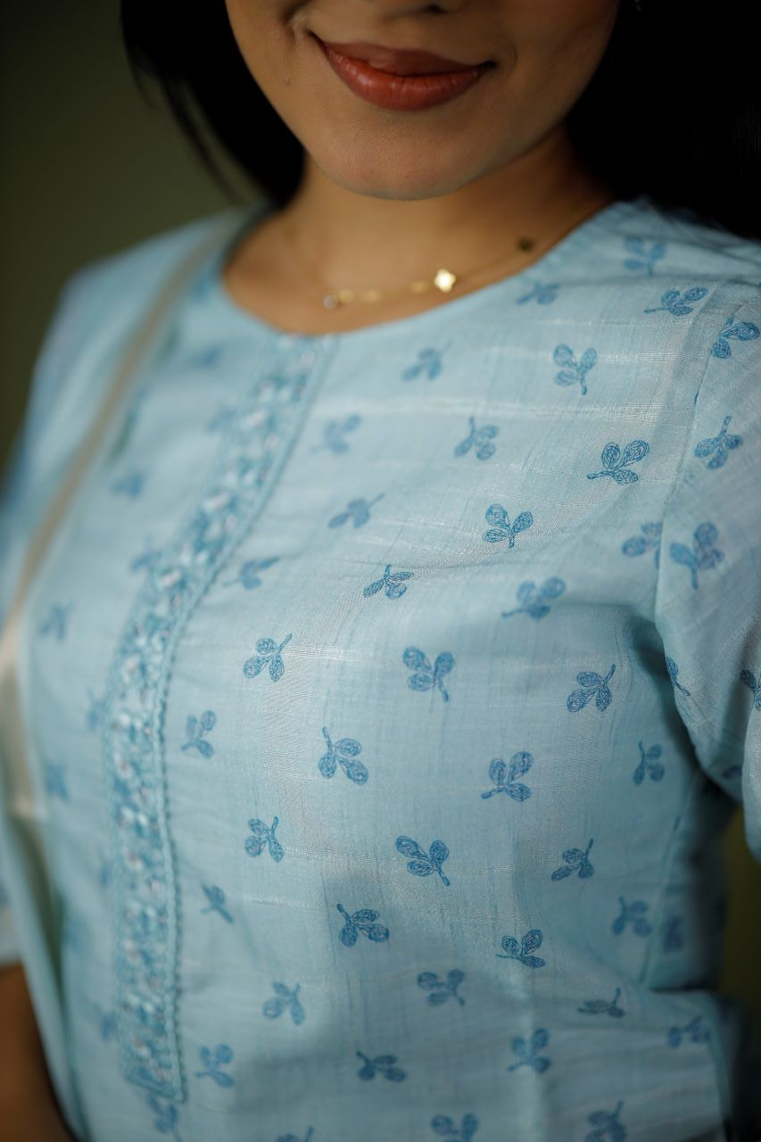 Kurta: Pastel blue shades with an intricate embroidered yoke.