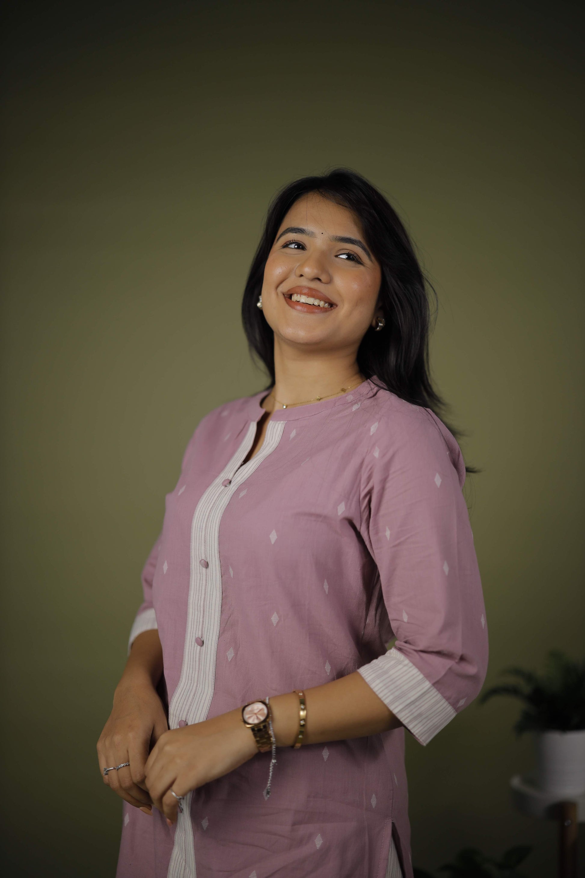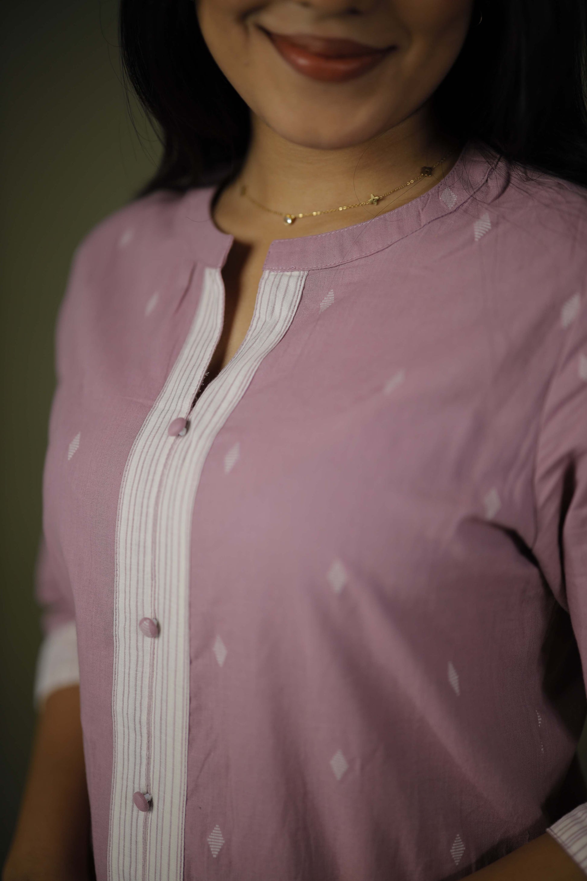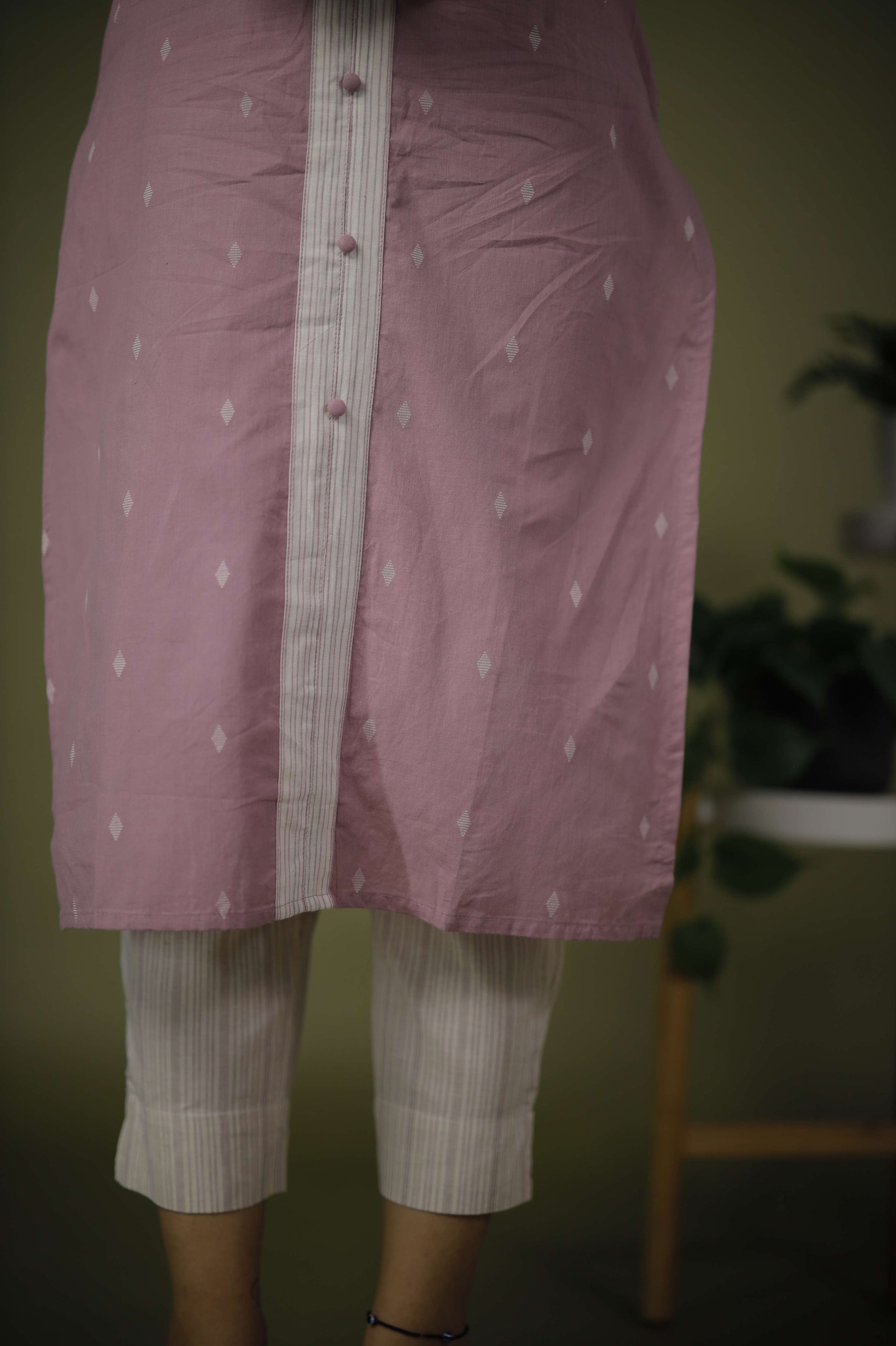 Kurta: Front button placket with contrasting white panel detailing, adding structure and a unique touch. Three-quarter sleeves with white cuffs for a clean and polished appearance.